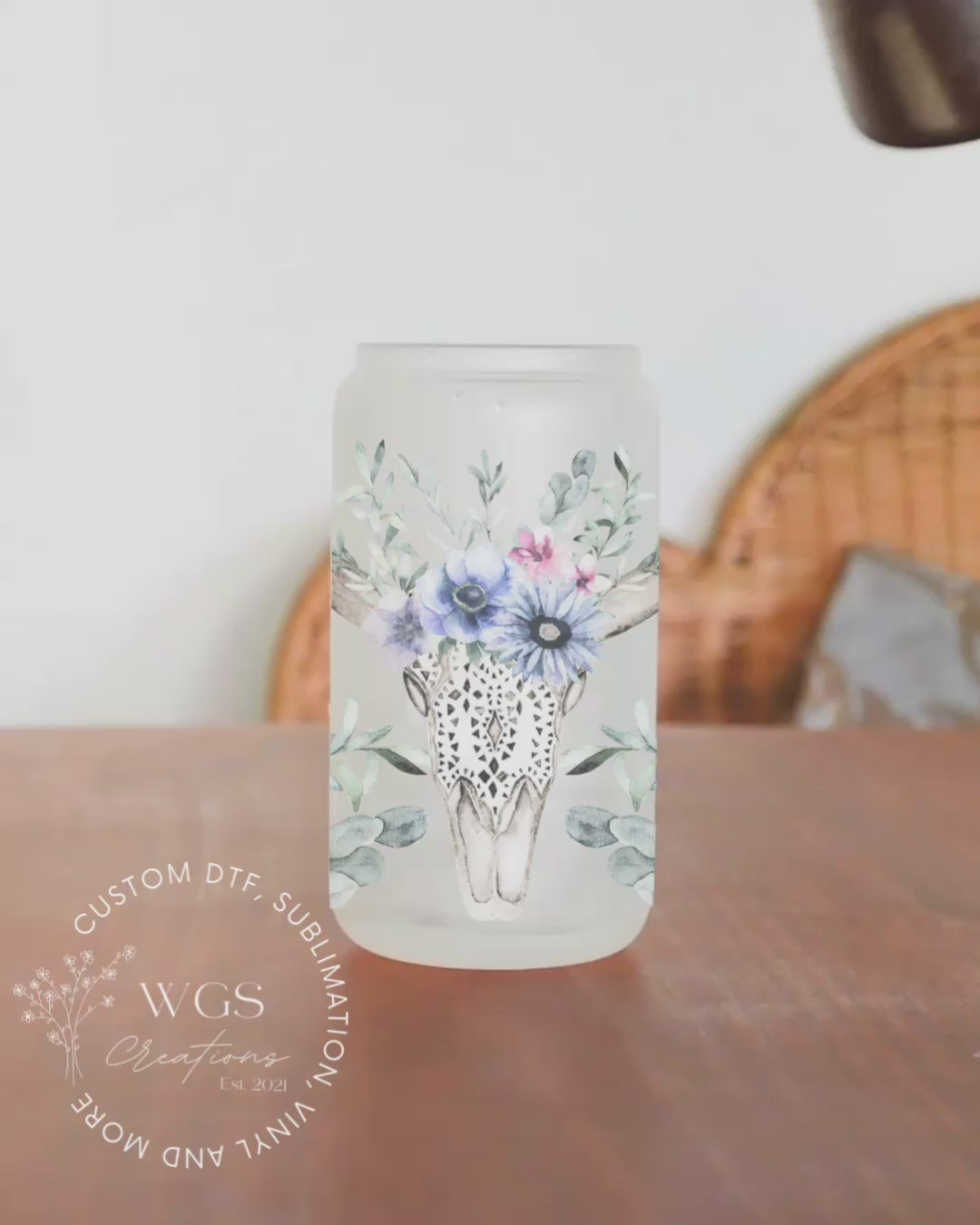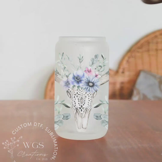 Floral Skull 16oz Frosted Glass Can